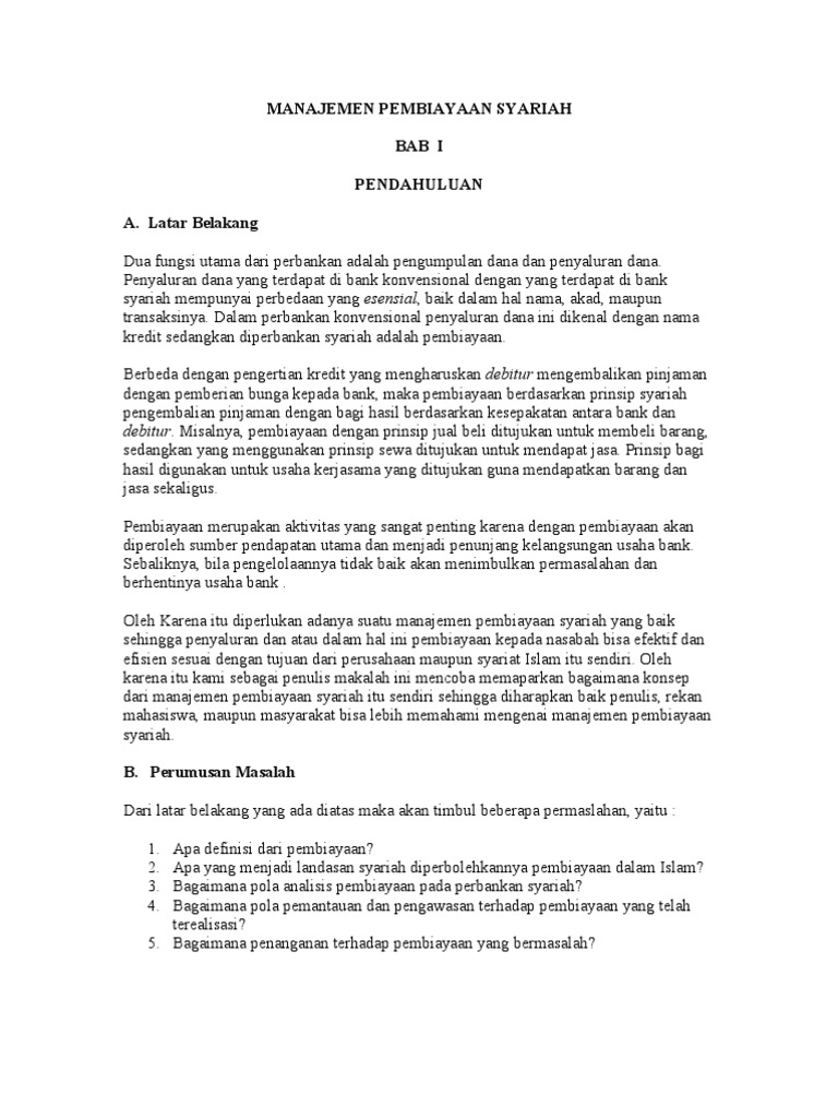 PDF Powered by TCPDF ( ) - UINSU biayaan dan Bank Syariah. Secara etimologi Manajemen berarti seni melaksanakan dan mengatur. Pembiayaan diartikan sebagai suatu kegiatan pemberian fasilitas keuangan/ finansial yang diberikan satu pihak kepada pihak lain untuk mendukung kelancaran usaha maupun untuk investasi yang telah direncanakan.