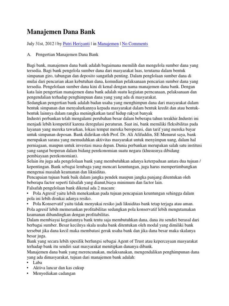 Manajemen Dana Bank - SlideShare Tujuan Manajemen Dana Bank Tujuan manajemen dana bank adalah: 1. Memaksimumkan kemakmuran pemegang saham dapat ditempuh dengan memaksimumkan nilai sekarang perusahaan. 2. Sebagai pedoman dalam pengambilan keputusan yang mempertimbangkan faktor risiko. 3. Mempertimbangkan kepentingan pemilik, kreditor dan pihak lain yang berkaitan dengan perusahaan.